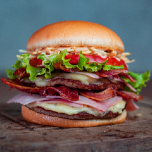 Pão brioche, 2 hambúrgueres de carne, 2 fatias de mussarela, presunto, alface, tomate, cebola caramelizada.