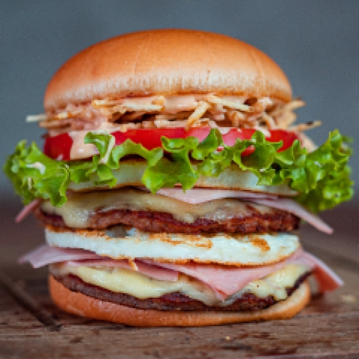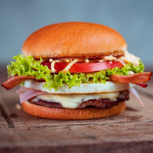 Pão brioche, hambúrguer de carne, ovo, banana, bacon, calabresa, mussarela, cebola caramelizada, alface, tomate, molho... Ver completo